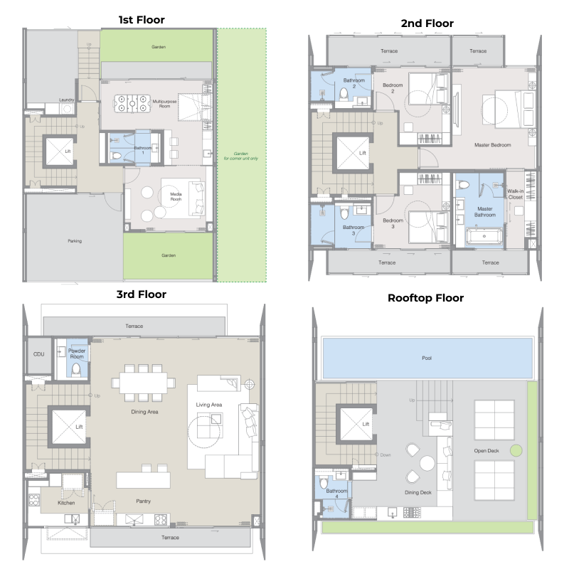 With the sapphire-blue sea to the west and emerald-green mountains to the east, enjoy the best of both views at the 4-storey Beach Terrace homes. Enter on the first floor that includes a generous living & entertainment area, along with a bespoke area that can be customised to individual needs.