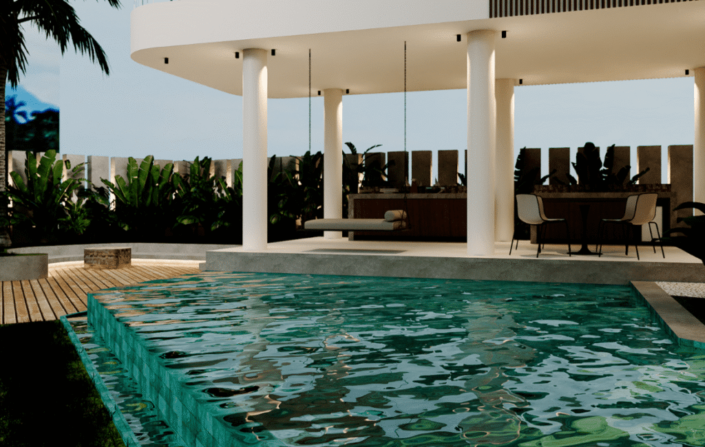 Also of note, the spacious rooftop lounge area offers unforgettable views not only of the ocean, but also of the river, and can be furnished to your liking. Descending from the rooftop to the courtyard, you enter the tropical garden, whose rich greenery will keep you cool on a hot tropical day just as much as the infinity pool, whose edge is flanked by views of the river.