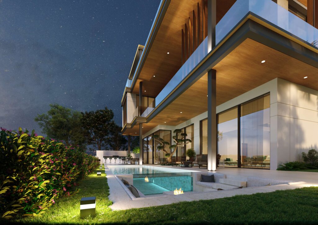 The exterior finish features a combination of glass, metal, wood, and textured natural stone to create a balance between futuristic and natural aesthetics. Additionally, the villa’s unique geometry is noteworthy, with its stepped structure, polished shapes, and sharp lines complemented by pergolas and transparent elements.